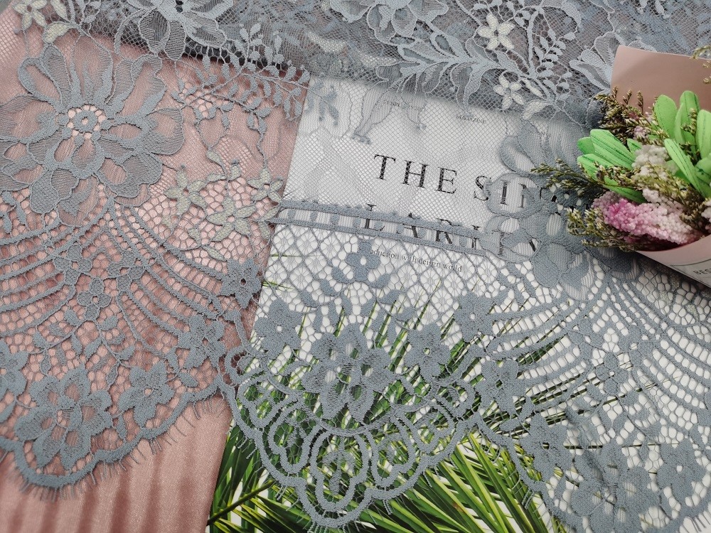 Le tissu de dentelle de Grey Eyelash Scallop Edge Corded pour la robe de petite fille de Garment Brands Home Textile de robe même de Madame pour les textiles à la maison, rideau, articles de literie, habillements, chapeaux, robes de mariage, chemisiers, Garments de Madame, nappe, robes de petites filles, façonnent les chaussures, le pantalon, les pantalons, les shorts, les vestes, etc. femelles.