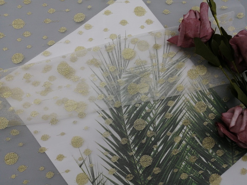 Le tissu métallique de dentelle de tissu de Dot Lurex Mesh Fabric Party d'or pour la robe de petite fille de Garment Brands de robe même de Madame est pour les textiles à la maison, rideau, articles de literie, habillements, chapeaux, robes de mariage, chemisiers, Garments de Madame, nappe, robes de petites filles, façonnent les chaussures, le pantalon, les pantalons, les shorts, les vestes, etc. femelles.