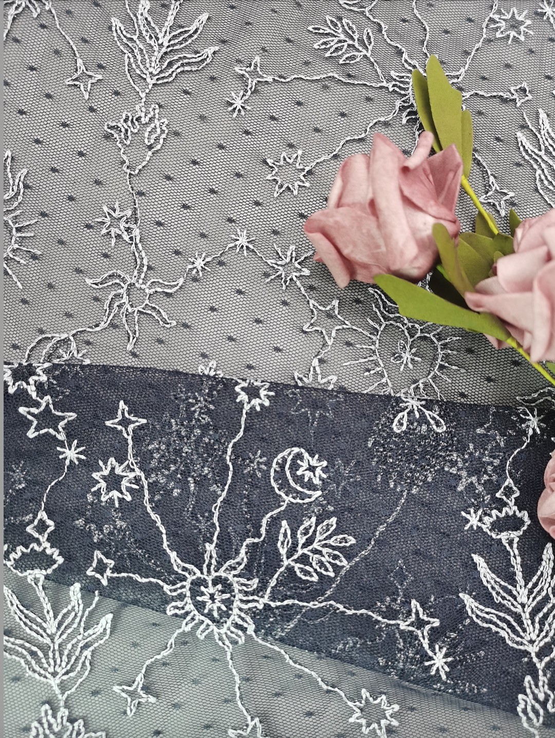 | Nom de production: | Tissu de dentelle brodé par étoile | La terre: | VISAGE 100%P : 100%P |