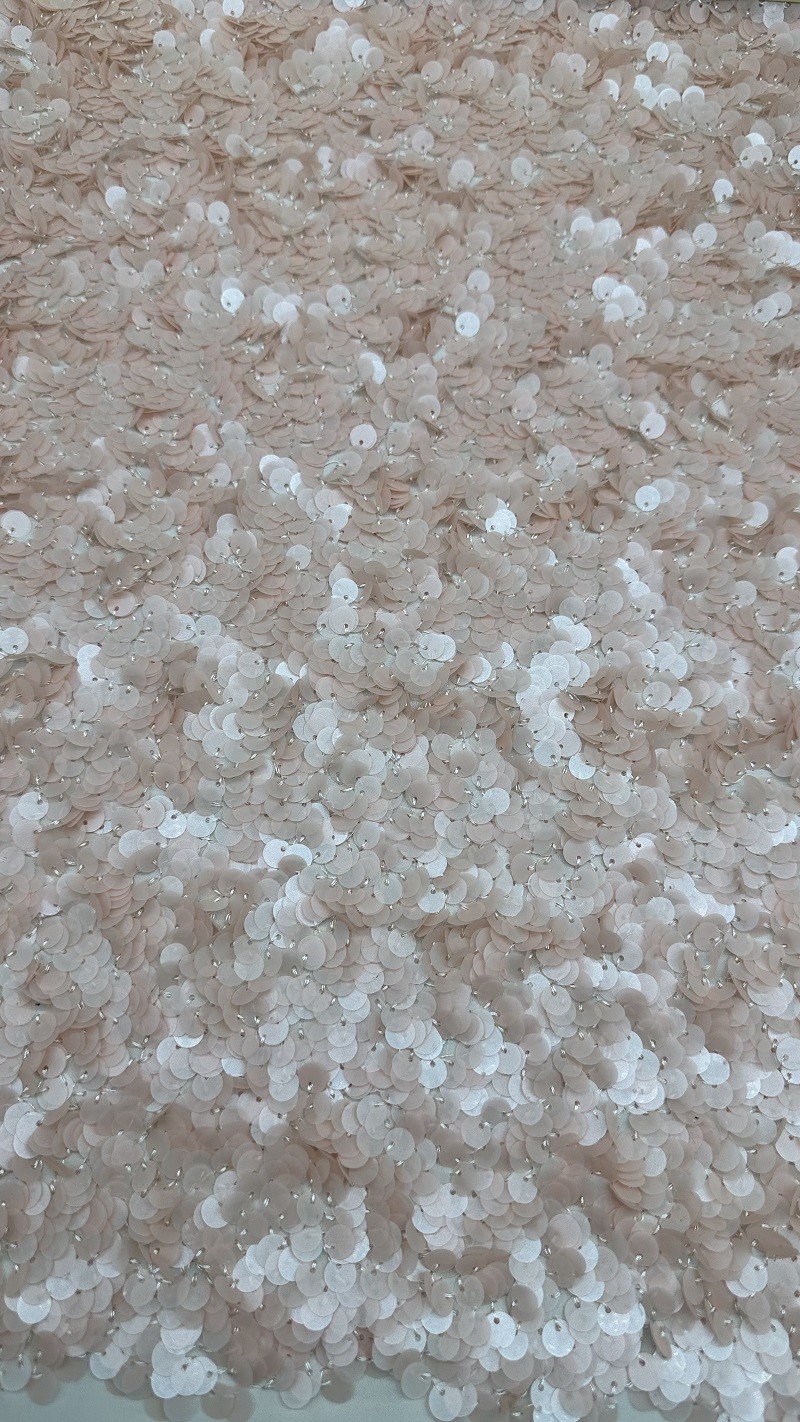 Le fond de maille du tissu brodé à la paille de fleurs fournit une base délicate et légère pour la broderie dense à la paille.permettant à la couleur champagne de briller tout en offrant une base stable pour le travail complexe séquinLe résultat est un tissu aussi durable qu'il est beau, avec une texture envoûtante qui invite au toucher et à l'admiration.