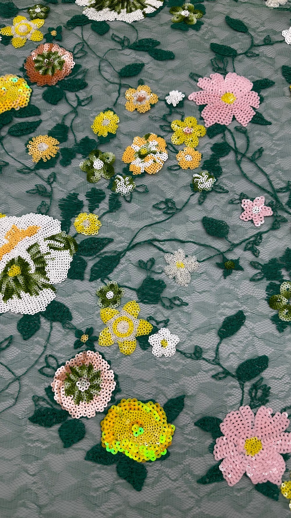 Les amateurs de paillettes seront ravis de ce tissu, car il a un design magnifique qui capte la lumière et ajoute une touche de lustre à n'importe quelle tenue.Le dessin des fleurs est complexe et détaillé., montrant l'habileté et le savoir-faire de la broderie.
