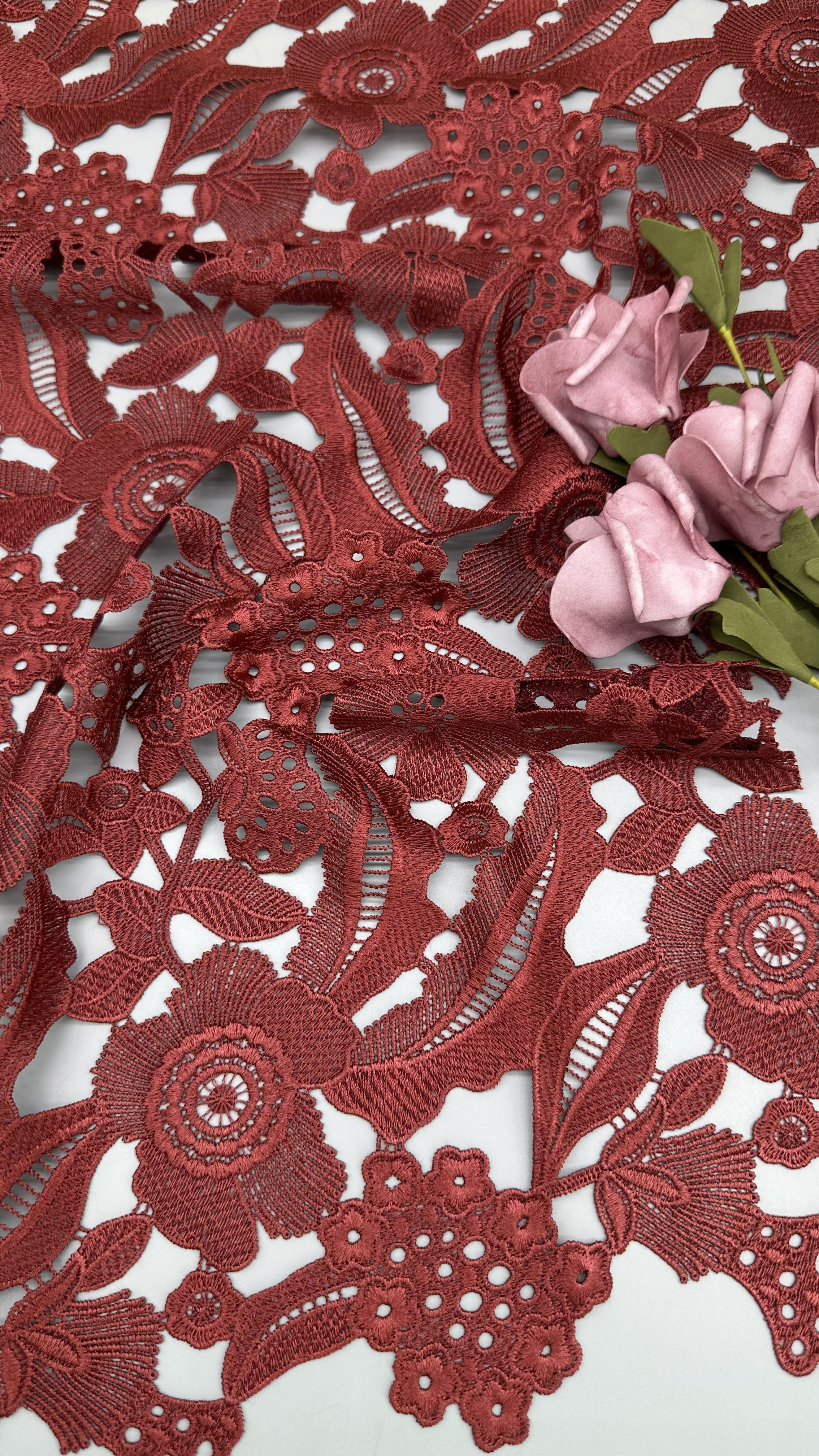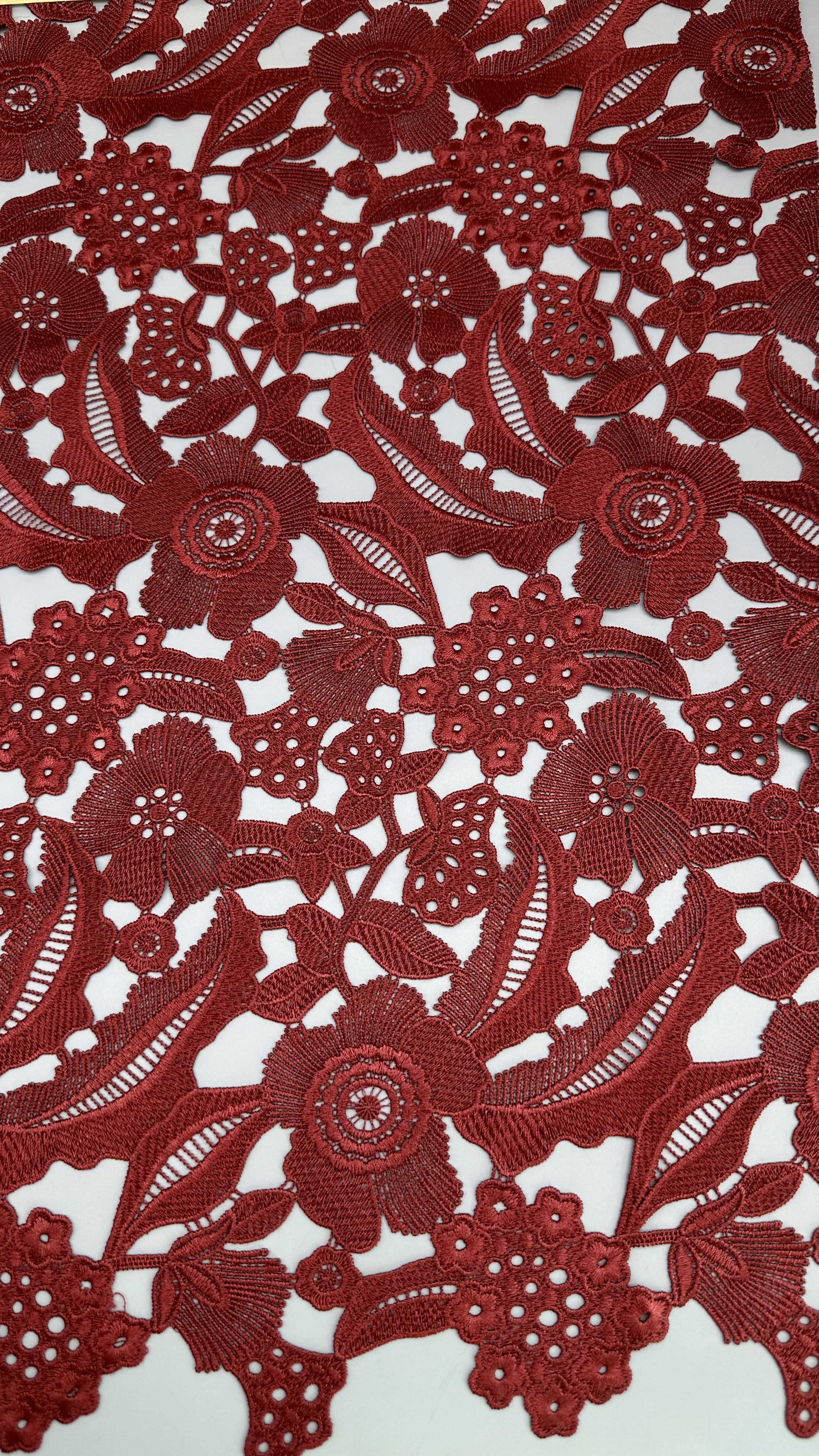 Mettre en évidence: | Le tissu de dentelle est creux.,Tissu de dentelle à broderie à feuilles,Un tissu de dentelle rouge élégant |