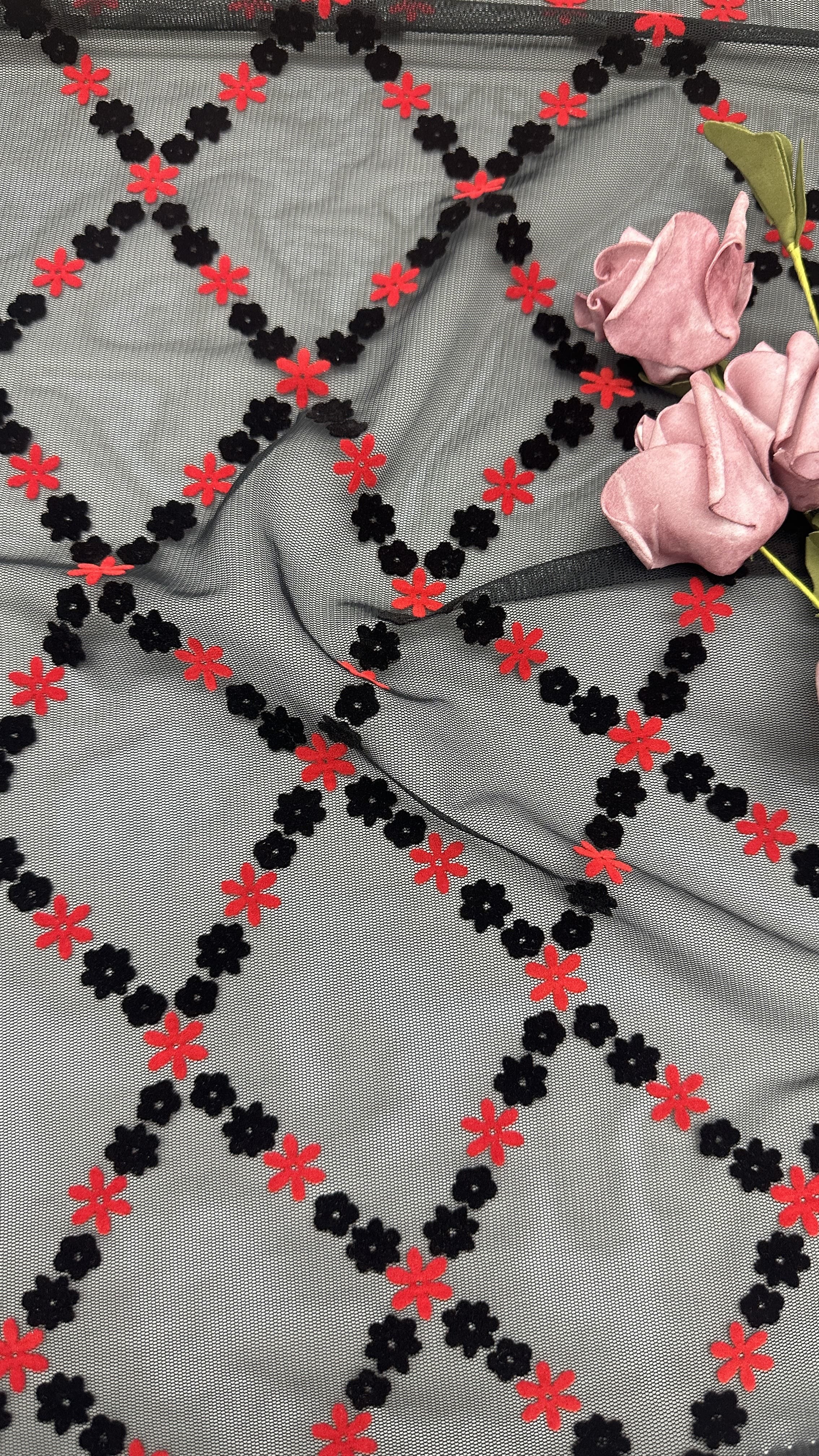 | Mettre en évidence: | small flower flocked mesh fabric,rose black lace fabric,customized gown flocked mesh |